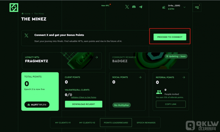 2、點擊proceeo?連接自己的X賬戶并關推,以獲得500個獎勵積分,并可以在X上發(fā)推文以解鎖加倍器。