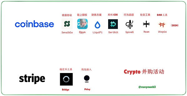 在融資之外,行業(yè)品牌自身也開(kāi)始相互耦合,體現(xiàn)為2024-2025年并購(gòu)周期,Coinbase收購(gòu)Deribit補(bǔ)齊期權(quán)市場(chǎng),Phantom收購(gòu)錢(qián)包工具 Bitski,安全產(chǎn)品Blowfish和交易工具SolSniper,甚至是Stripe也在收購(gòu)錢(qián)包服務(wù)Privy和穩(wěn)定幣工具Bridge。