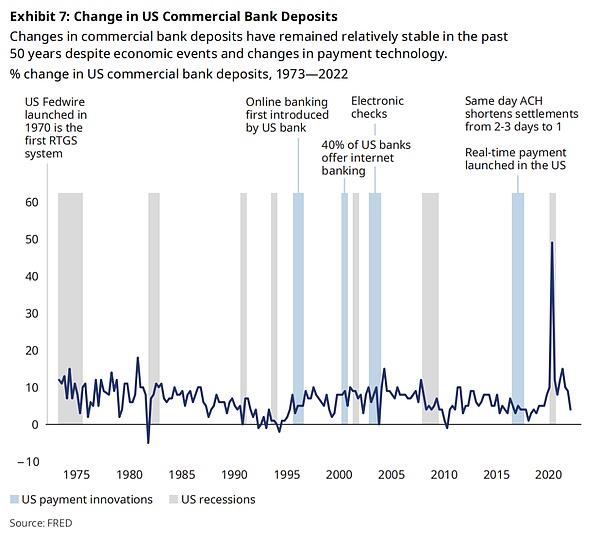 上圖為美國商業銀行存款變動。近50年來,盡管經歷經濟事件與支付技術變革,美國商業銀行存款的變動幅度仍保持相對穩定。