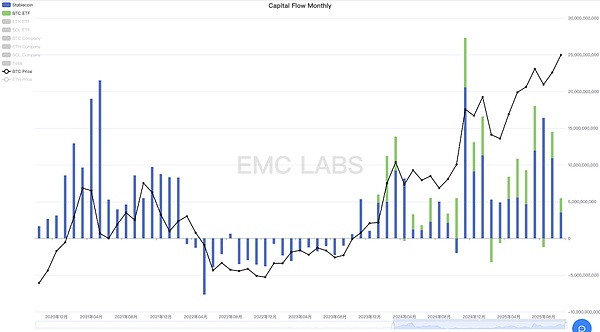 BTCSpotETF及穩定幣通道資金流動月度統計