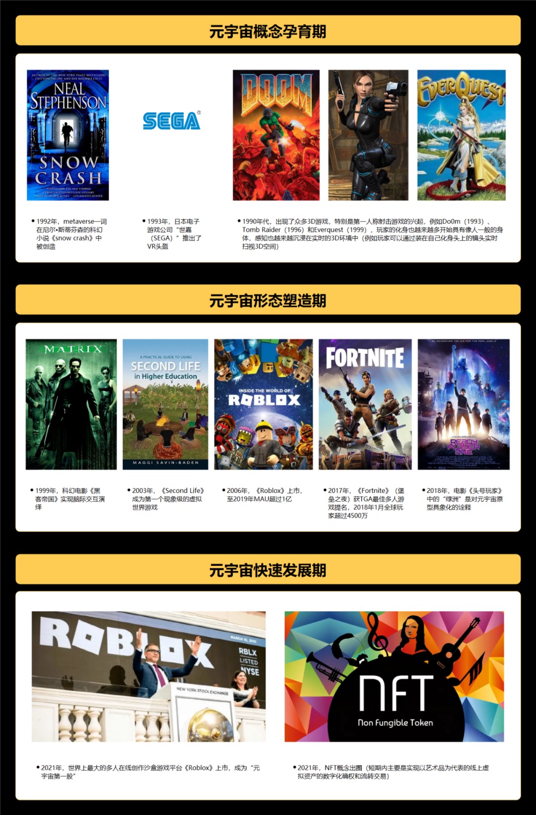 90年代還出現了眾多3D游戲,玩家的化身也越來越多開始具有像人一般的身體,感知也越來越沉浸在實時的3D環境中。赫胥黎想象中的設備(商業VR)也是在這個時候出現。此時元宇宙的概念雖未被提出,但什么是元宇宙似乎已逐漸明了,就是讓人們能夠在虛擬世界中享受沉浸式體驗。而后《黑客帝國》和《頭號玩家》,則把這種真實世界與虛擬世界的交互通過大熒屏演示了出來,后者構建出的“綠洲”,其實非常接近當下提出的元宇宙概念了。而真正將元宇宙概念推向高潮,是2021年。有兩件標志性事件,Roblox上市,成為“元宇宙第一股”,以及NFT(Non Fungible Token,即非同質化Tokens)出圈。