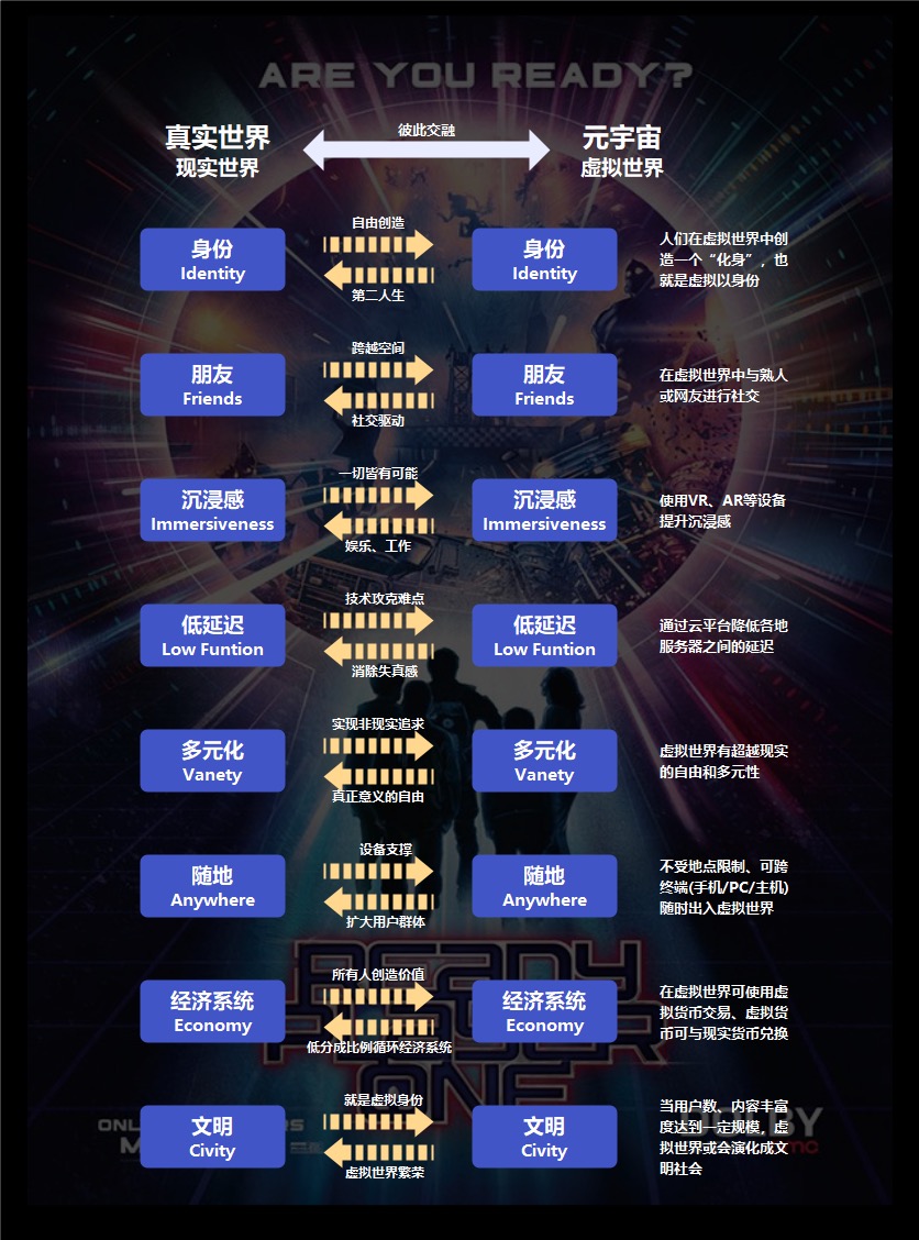 雖然也有元宇宙六大要素(可交互、共識規則、價值生成、體驗、經濟系統)的說法,但不管哪種說法,我們在元宇宙感受到的,理論上應該跟真實世界感覺一樣,并且我們可以在元宇宙世界和真實世界來回穿梭。