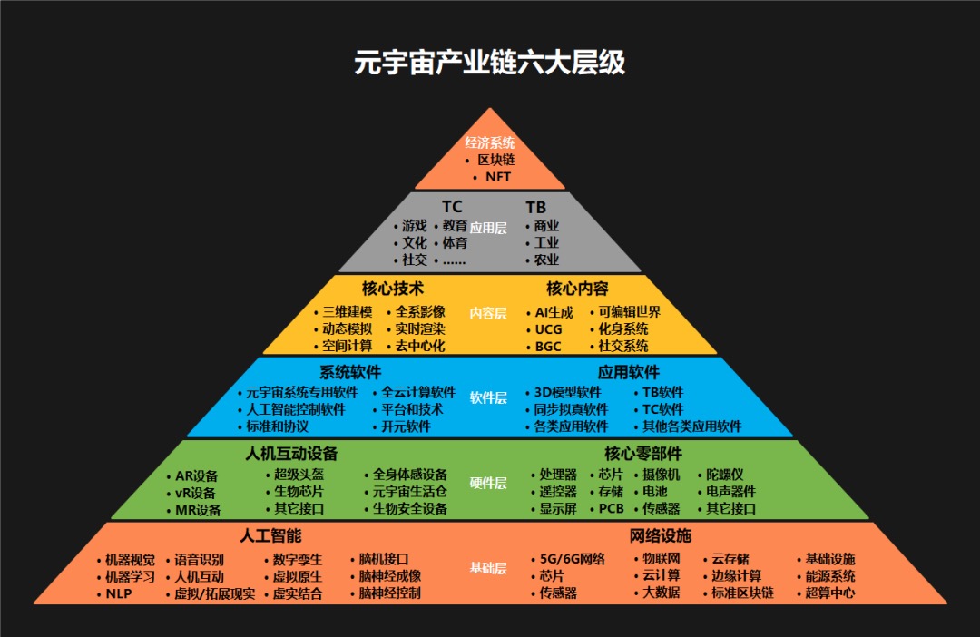 元宇宙概念的爆火,將帶動整條產業鏈的發展。下面這張圖展示的就是元宇宙產業鏈的六大層級,從上至下依次是經濟系統、應用層、內容層、軟件層、硬件層、基礎層。每一層都有對應的支撐技術。