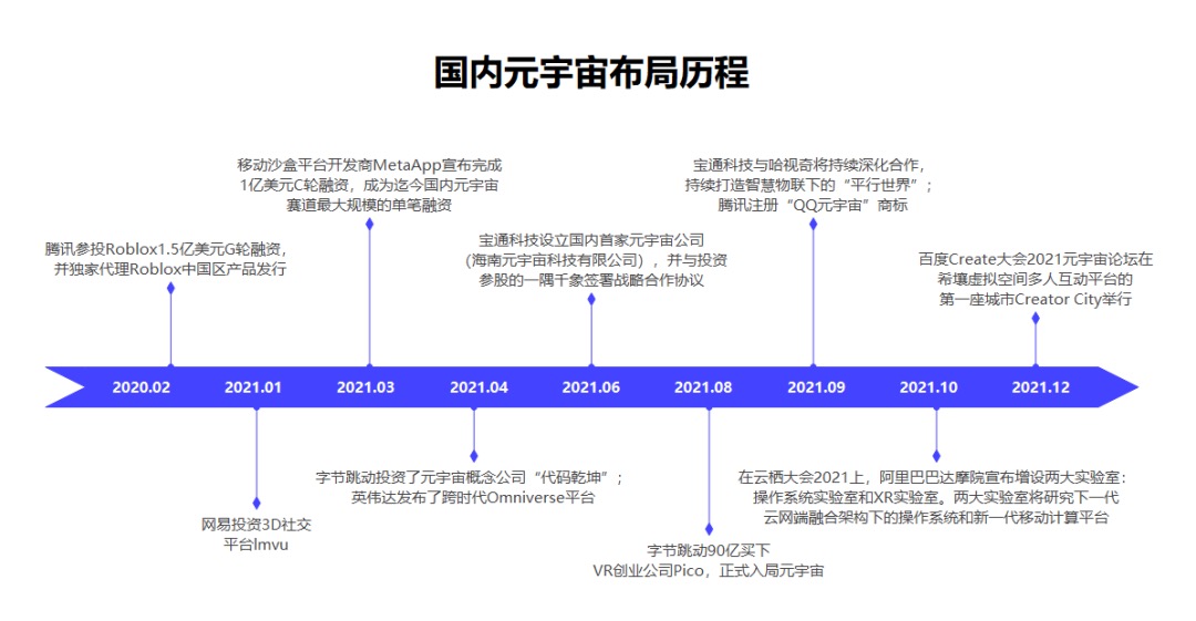 國內企業,主要是互聯網大廠,2020年就開始爭相布局,比如:騰訊參投Roblox,網易投資Imvu,字節跳動買下Pico,阿里達摩院增設操作系統實驗室和XR實驗室,百度甚至直接把Create大會開在了希壤虛擬空間......
